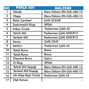 Sit yüzeyi sert Krom veya AISI 316 paslanmaz çelik kaynak dolgu olarak imal edildiğinden sit yüzeyi aşınmaya ve korozyona dirençlidir. Kelebek vanalarımız çift eksantrik olarak imal edilmektedir. Birinci eksantriğin amacı vananın açılması sırasında kauçuk sızdırmazlık ringinin üzerindeki basıncın azaltılması, aşındırıcı etkinin ortadan kalkması ve sızdırmazlık ringi ile gövde siti arasında kesintisiz bir temasın elde edilmesi sağlanmaktadır. Vananın açılma işlemi sırasında kauçuk sızdırmazlık ringi gövde sit yüzeyinden ikinci eksantriğin yardımı ile kolaylıkla ayrılır. Vana içersinde geçiş kesitini artıran çift parçalı mil tasarımı bulunmaktadır. Mil sızdırmazlığı ise bronz ve delrinden imal edilen kendinden yağlamalı burçların üzerine yapılan O-ring sistemi ile vanaların bakım gerektirmeden daha uzun ömürlü olmasını sağlamaktadır. Dişli kutuları kelebek vanalar tarafından gerek duyulan çeyrek tur (90o) haraketi sağlar. Dişli kutuları kelebek vanaların tek taraftan etkiyen anma basıncı altında bir kişi tarafından el ile volanı çevirerek açılmasını sağlayacak şekilde dizayn edilmiştir. Kilitlenebilir tipte olup, akış koşullarından klape üzerine etkiyen kuvvetlerin klapeyi döndürmesine olanak vermez. Dişli kutusu çıkış flanşları her türlü elektrikli aktüatörün montajına uygun olarak imal edilmektedir. Dizayn: TS EN 593 uygun olarak üretilmektedir. Bağlantı boyu: TS EN 558-1 Flanş bağlantıları: EN 1092-2; ISO 7005-2