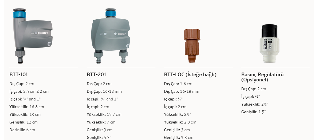 Bluetooth® özellikli, pilli ve iOS veya Android akıllı telefonlarla kontrol edilen musluk zamanlayıcısı BTT sayesinde, en küçük alanların bile yeterli miktarda sulanmasını sağlayın. BTT, toprağa gömülü sulamanın elverişli olmadığı yerlerdeki küçük çim alanların, fidanlıkların, çiçek tarhlarının, saksı bitkilerinin, terasların, seraların ve bahçelerin bakımı için harika bir dayanıklı kablosuz iç ve dış mekan çözümüdür.