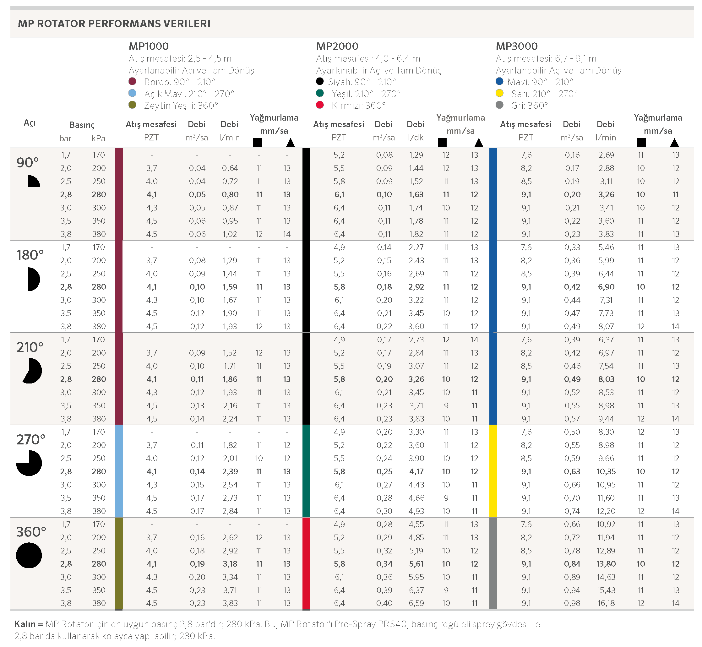 • Basınç regülasyonunun 2,8 bar olması için Pro-Spray™ PRS40 pop-up ile eşleştirin; nominal atış mesafesi ayarları için 280 kPa