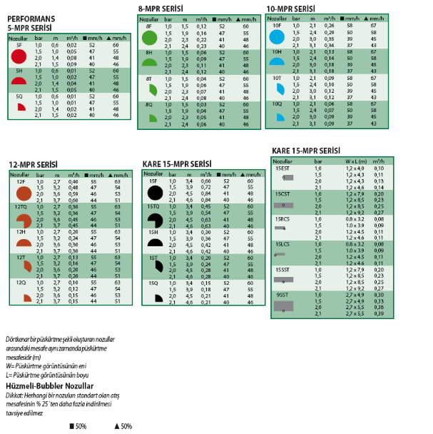- Debi miktarı farklı nozul püskürtme şekilleri birbirine ayarlıdır.