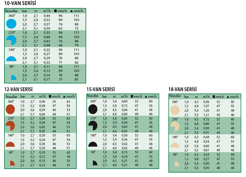 • Daha uygun şartlarda kullanım için, bu sprey başlıklar önceden monte edilmiş VAN Nozullarla birlikte gönderilmektedir.